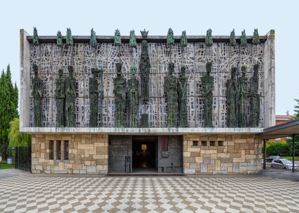 En la fachada frontal del Santuario de la Virgen del Camino destacan sus estatuas de bronce