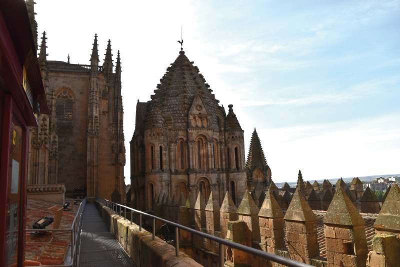 Continuamos el recorrido por la Triforio Catedral Nueva, un paseo desde el que vemos las columnas, bóvedas, cristaleras y todos los detalles de la misma. A través de una escalera de caracol del S.XVI llegamos al tejado de la Catedral Nueva para asomarnos a la Terraza de Anaya. En este punto del recorrido encontramos una nueva y única visión del conjunto catedralicio. Observamos, entre otras cosas, la Plaza de Anaya, el Convento de San Esteban, la Rúa, la Plaza Mayor y las dos Universidades que hay en la ciudad.